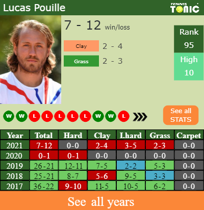 In terms of his career, Pouille has an overall 297-204 record. He has a positive 23-20 record on grass.