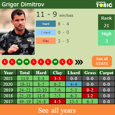 Dimitrov has an overall 11-9 win-loss record in 2021, 0-0 on grass (See FULL STATS).