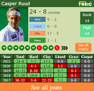 Casper has a composed 24-8 win-loss record in 2021, 2-1 on grass (See FULL STATS).