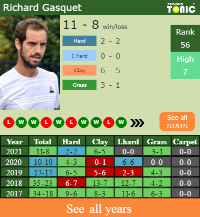 This will be the 21st time that Roger Federer and Richard Gasquet face off. The head to head is 18-2 for Federer (see full H2H stats), 3-0 on grass.