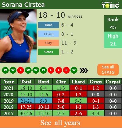 Cirstea has an aggregate 18-10 win-loss record in 2021, 1-2 on grass (See FULL STATS).