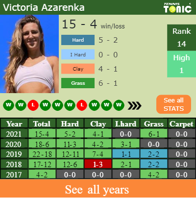 The Belarussian has an aggregate 15-4 win-loss record in 2021, 6-1 on grass (See FULL STATS).