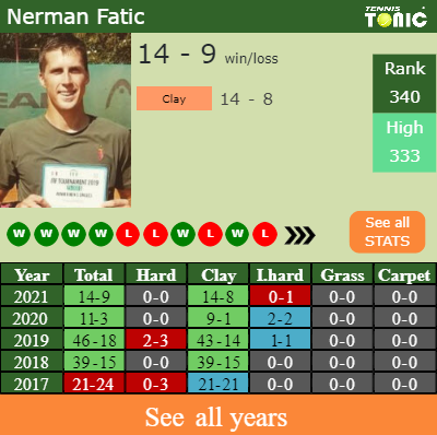 The Bosnian has an overall 14-9 win-loss record in 2021, 14-8 on clay (See FULL STATS).