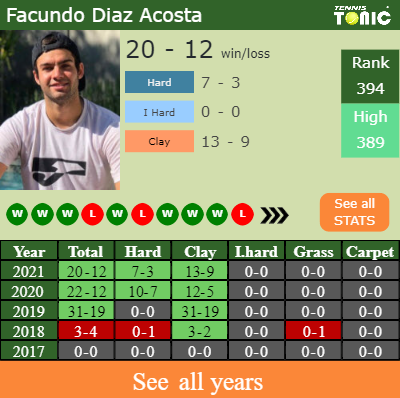 The Argentine has an overall 20-12 win-loss record in 2021, 13-9 on clay (See FULL STATS).
