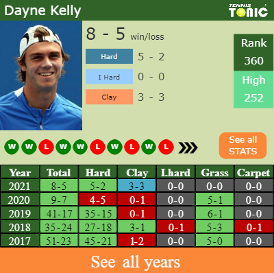 Kelly has an aggregate 8-5 win-loss record in 2021, 3-3 on clay (See FULL STATS).