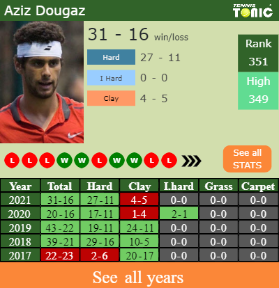 Dougaz has a composed 31-16 win-loss record in 2021, 4-5 on clay (See FULL STATS).