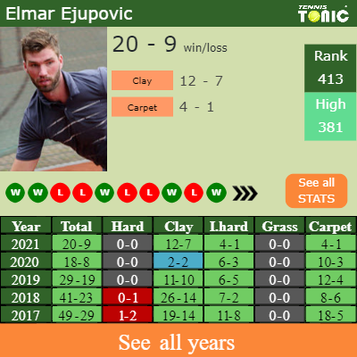 Ejupovic has an aggregate 20-9 win-loss record in 2021, 12-7 on clay (See FULL STATS).