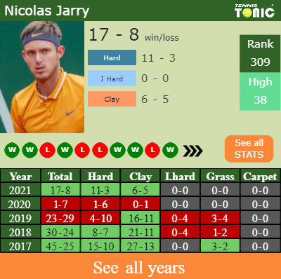 Jarry has a winning record in the last 9 years having won 59% of his matches (266-185). 6-5 on clay in 2021. In connection with his performance on the same surface of this tournament, Jarry has a compiled209-113 win-loss record in the last 9 years on clay.