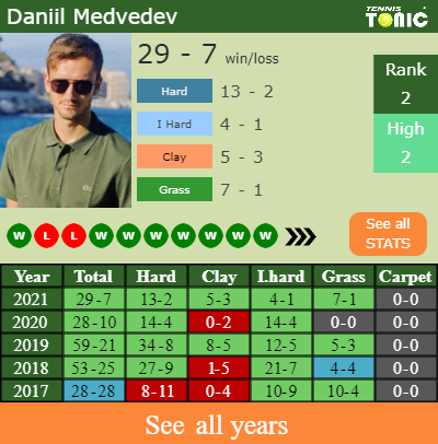 Medvedev has an aggregate 29-7 win-loss record in 2021, 7-1 on grass (See FULL STATS).