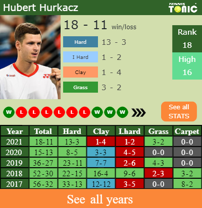 Hubert has a compiled 18-11 win-loss record in 2021, 3-2 on grass (See FULL STATS).