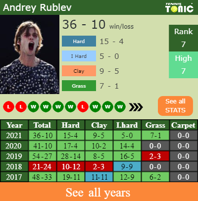 Rublev has a compiled 36-10 win-loss record in 2021, 7-1 on grass (See FULL STATS).