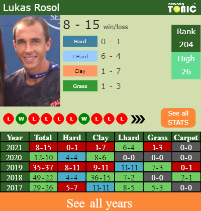 Rosol has an aggregate 8-15 win-loss record in 2021, 1-7 on clay (See FULL STATS).