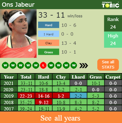 The Tunisian has an aggregate 33-11 win-loss record in 2021, 10-1 on grass (See FULL STATS).