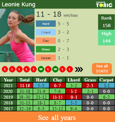 Leonie has an aggregate 11-18 win-loss record in 2021, 0-7 on clay (See FULL STATS).