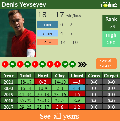 - Denis YevseyevYevseyev – Pablo CuevasCuevas (0-0) – H2H and prediction