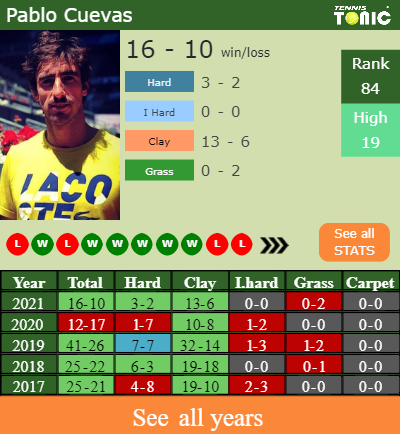 Pablo has an overall 16-10 win-loss record in 2021, 13-6 on clay (See FULL STATS).