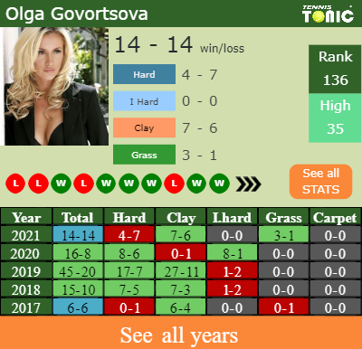 Olga has an aggregate 14-14 win-loss record in 2021, 7-6 on clay (See FULL STATS).