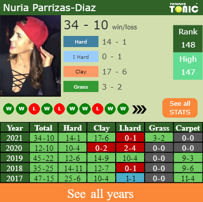Nuria has an aggregate 34-10 win-loss record in 2021, 17-6 on clay (See FULL STATS).