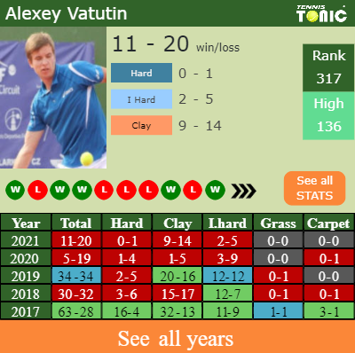 Alexey has an overall 11-20 win-loss record in 2021, 9-14 on clay (See FULL STATS).
