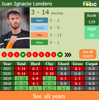 Londero has a good record in the last 10 years having won 58% of his matches (337-248). 3-11 on clay in 2021. Regarding his performance on the same surface of this tournament, Londero has an overall 293-193 match record in the last years on clay.