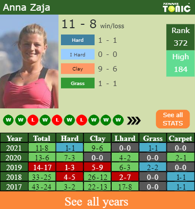 Anna has an overall 11-8 win-loss record in 2021, 9-6 on clay (See FULL STATS).