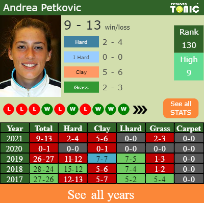 Petkovic has an aggregate 9-13 win-loss record in 2021, 5-6 on clay (See FULL STATS).
