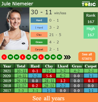 Niemeier started her run at this tournament from the qualifications. In the main draw, she has conceded 1 set in the tournament to win 54% of the points she played.
