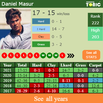 Daniel has a composed 17-15 win-loss record in 2021, 0-5 on clay (See FULL STATS).