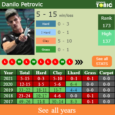 Petrovic has an aggregate 5-15 win-loss record in 2021, 5-10 on clay (See FULL STATS).