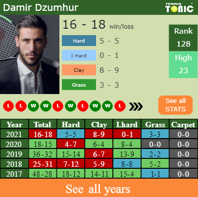 The Bosnian has a composed 16-18 win-loss record in 2021, 8-9 on clay (See FULL STATS).