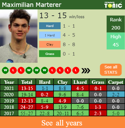 Marterer has an overall 13-15 win-loss record in 2021, 8-8 on clay (See FULL STATS).