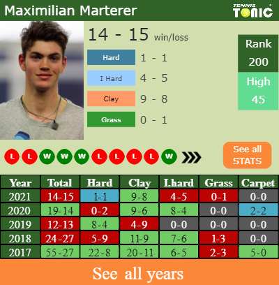 The German has an overall 14-15 win-loss record in 2021, 9-8 on clay (See FULL STATS).