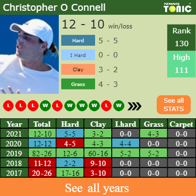 O Connell has a solid record in the last 9 years having won 64% of his matches (261-150). 3-2 on clay in 2021. Talking about his performance on the same surface of this competition, O Connell has an aggregate141-68 win-loss record in the last 9 years on clay.