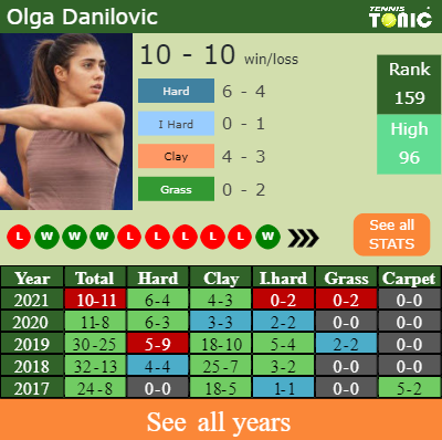 Danilovic has a solid match record in the last 6 years having won 62% of her matches (115-69). 4-3 on clay in 2021. In connection with her performance on the same surface of this event, Danilovic has a compiled74-29 match record in the last 6 years on clay.