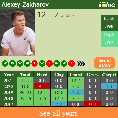 Alexey has an aggregate 12-7 win-loss record in 2021, 0-0 on hard (See FULL STATS).