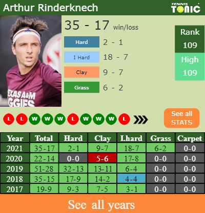 Arthur has an aggregate 35-17 win-loss record in 2021, 9-7 on clay (See FULL STATS).