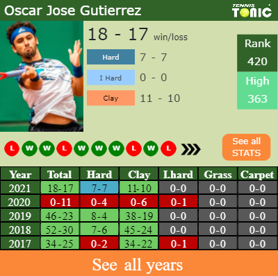 Oscar has a compiled 18-17 win-loss record in 2021, 11-10 on clay (See FULL STATS).