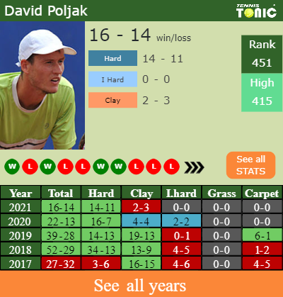 David has an overall 16-14 win-loss record in 2021, 2-3 on clay (See FULL STATS).