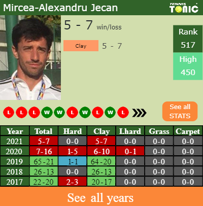 Jecan has an aggregate 5-7 win-loss record in 2021, 5-7 on clay (See FULL STATS).