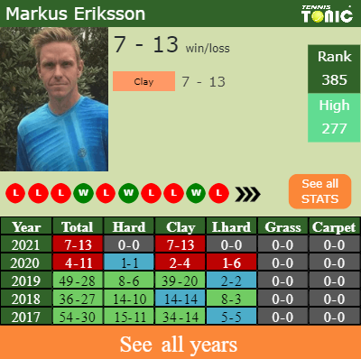 In terms of his career, Eriksson has an overall 393-292 record. He has a positive 253-174 record on clay.