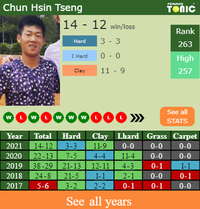 Talking about his overall career, Hsin Tseng has an overall 108-71 record. He has a positive 60-31 record on hard.