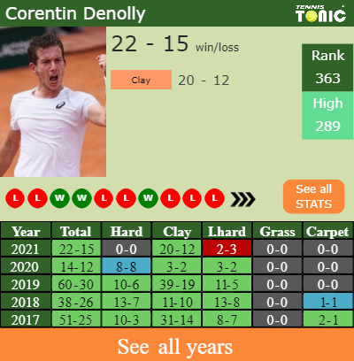 In terms of his career, Denolly has an overall 255-152 record. He has a positive 51-36 record on hard.