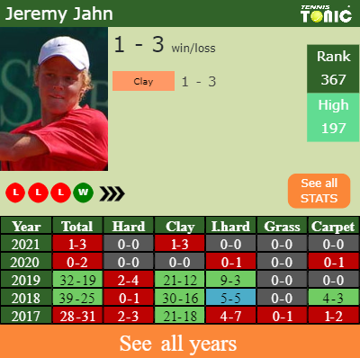 Jahn has a solid record in the last 10 years having won 62% of his matches (244-147). 1-3 on clay in 2021. Talking about his performance on the same surface of this tournament, Jahn has an aggregate 175-93 record in the last years on clay.