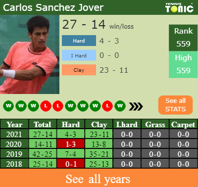 In the qualifications, Carlos had a good straight sets win against Martos Gornes (6-4 6-4). During the match Sanchez scored 68 points vs Martos Gornes’s 54. Carlos was quite aggressive to blast 28 winners.