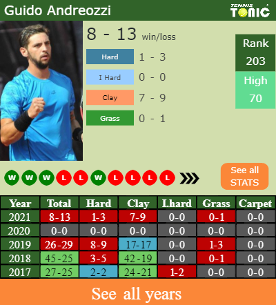 The Argentine has an aggregate 8-13 win-loss record in 2021, 7-9 on clay (See FULL STATS).