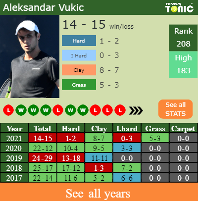 Vukic has an aggregate 14-15 win-loss record in 2021, 8-7 on clay (See FULL STATS).