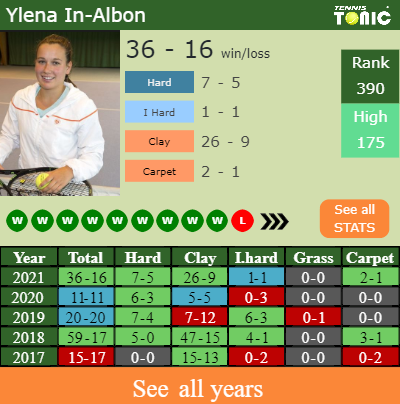 Ylena has an overall 36-16 win-loss record in 2021, 26-9 on clay (See FULL STATS).