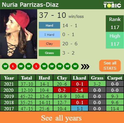 Nuria has a compiled 37-10 win-loss record in 2021, 14-1 on hard (See FULL STATS).