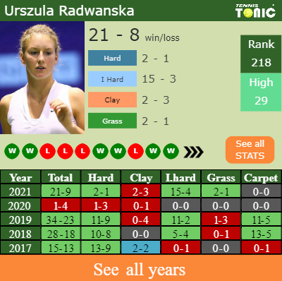 Urszula has an aggregate 21-9 win-loss record in 2021, 2-1 on hard (See FULL STATS).