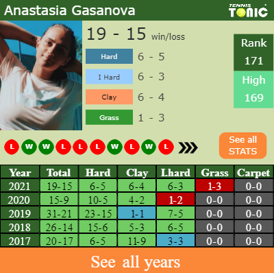 Gasanova has a composed 19-15 win-loss record in 2021, 6-5 on hard (See FULL STATS).